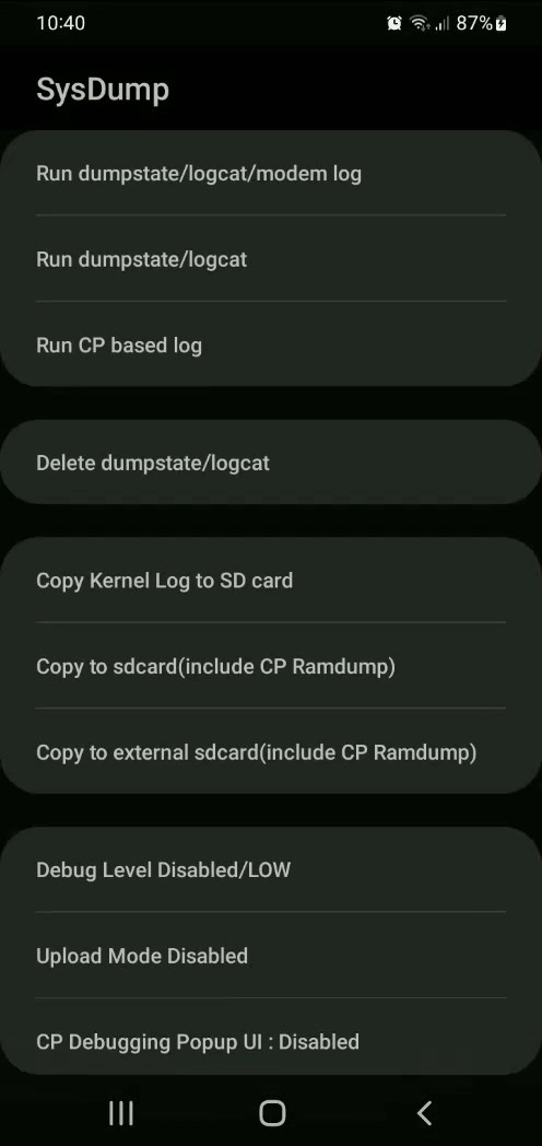 Lo más parecido al volcado de sistema de Huawei es el menú de proyecto, al que se accede con el código *#*#2846579#*#*. Este menú ofrece las mismas opciones que el volcado de sistema de Samsung.